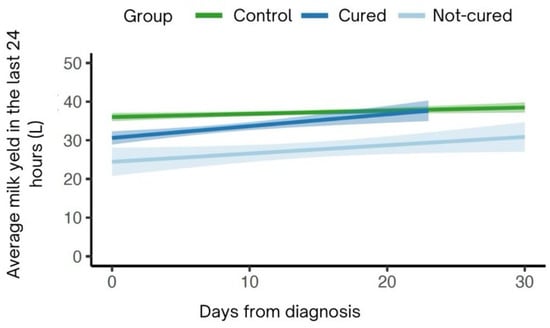 Average milk yield in the last 24 h (in liters) of cured and non-cured mastitis cows over time compared to the control group. The shaded area around the lines represents the 95% CI (confidence interval). Groups: Control (green line)—cows without mastitis; Cured (blue line)—cows that recovered from clinical mastitis; Non-cured (light blue line)—cows that did not recover from clinical mastitis during the experimental period of 30 days.