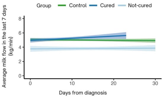 Average milk flow in the last 7 days (kg/min) of cured and non-cured mastitis cows over time compared to the control group. The shaded area around the lines represents the 95% CI (confidence interval). Groups: Control (green line)—cows without mastitis; Cured (blue line)—cows that recovered from clinical mastitis; Non-cured (light blue line)—cows that did not recover from clinical mastitis during the experimental period of 30 days.