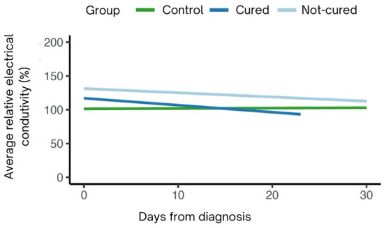 Average relative electrical conductivity (%) in the last 24 h of cured and non-cured mastitis cows over time compared to the control group. The shaded area around the lines represents the 95% CI (confidence interval). Groups: Control (green line)—cows without mastitis; Cured (blue line)—cows that recovered from clinical mastitis; Non-cured (light blue line)—cows that did not recover from clinical mastitis during the experimental period of 30 days.