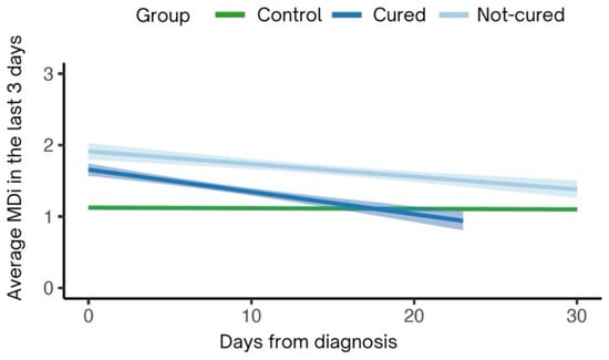 Average MDi in the last 3 days of cured and non-cured mastitis cows over time compared to the control group. The shaded area around the lines represents the 95% CI (confidence interval). Groups: Control (green line)—cows without mastitis; Cured (blue line)—cows that recovered from clinical mastitis; Non-cured (light blue line)—cows that did not recover from clinical mastitis during the experimental period of 30 days.