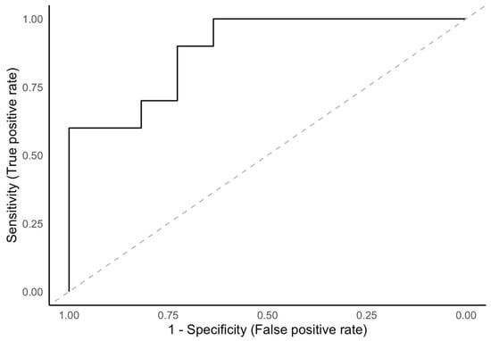 Binary outcomes (cure within 14 days) were analyzed using generalized mixed logistic regression with the “glmer” function from the “lme4” package, considering the random effect of the cow to control variance between cows. The covariates included in the model were DIM, parity, average MDi in the last 3 days, average milk yield in the last 24 h, and average relative EC of the affected quarter. Due to the low number of mastitis cases, behavioral data were not included. Two exploratory predictive models were created and evaluated for their ability to predict the outcome of interest: model 1—prediction of clinical mastitis cure at 14 days based on data from the day of diagnosis (D0); model 2—prediction of clinical mastitis cure at 14 days based on variations between D0 and D3. Due to overfitting indications (Se = 1.00 and Sp = 1.00), model 2 is not further addressed. To evaluate the predictive performance of model 1, sensitivity (Se) and specificity (Sp) were calculated using the ROC (Receiver Operating Characteristic) curve. The AUC (area under the curve) value and its confidence interval were also calculated. The calculations for Se and Sp are as follows: