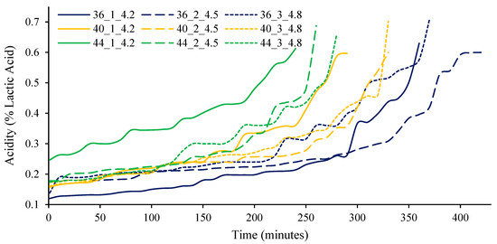 The pH profiles of yogurts prepared under varying fermentation temperatures, protein concentrations, and inoculum percentages are shown in Figure 1. Two distinct phases can be identified in the pH decline curves: the first corresponds to the lag phase, characterised by a slow decrease in pH (values above 5.8), while the second corresponds to the logarithmic phase, during which the pH rapidly decreases to a value near 4.6. In the yogurt industry, a pH of approximately 4.6 is considered the typical endpoint of fermentation, as it coincides with the isoelectric point of casein, where the protein loses its net charge, becomes destabilised, and precipitates, leading to gel or curd formation [31]. Both fermentation phases were clearly observed in this study. However, other authors have reported an additional third stage, known as the deceleration phase of acidification, which occurs below the isoelectric point of casein [32]. This final phase could not be observed, probably because the culture had not produced enough acid or depleted the lactose, meaning it had not yet entered self-inhibition or slowdown; therefore, the late plateau falls outside the monitoring window