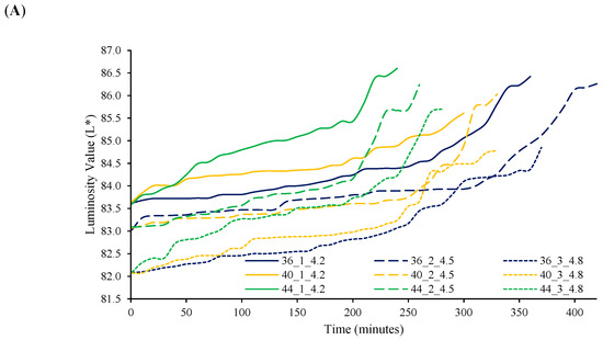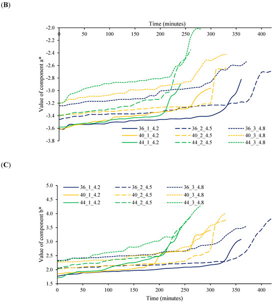 Variation in CIELAB colour parameters during yogurt fermentation: (A) L* component, (B) a* component, and (C) b* component. Note: “36_2_4.2” refers to a fermentation at 36 °C, 2% starter concentration, and 4.8% protein content.