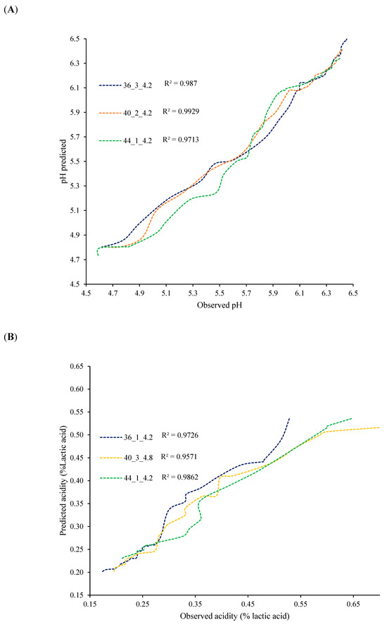 Relationship between experimental and predicted values versus estimated values (ANN model): (A) pH and (B) titratable acidity. Note: “36_1_4.2” refers to a fermentation at 36 °C, 1% starter concentration, and 4.8% protein content.