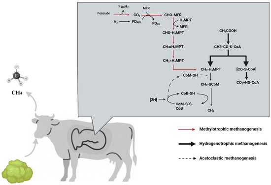 A small amount of EME is produced in the gut and feces, while most of it is produced by methanogens in the rumen. Methanogens are strictly anaerobic bacteria, which are Archaea capable of anaerobic fermentation of inorganic or organic compounds into CH4. According to the substrates used, they can be divided into three types: methylotrophic, hydrogenotrophic, and acetoclastic. Hydrogenotrophic methanogens mainly include Methanobacterium, Methanococcus, and Methanobrevibacters, which are the main pathway of CH4 production in the rumen (Figure 2). This pathway uses CO2 and H2 as substrates, and there are seven reactions that produce CH4, comprising the Wolfe cycle. Carbon dioxide first combines with methanofuran (MFR) to form formyl groups, and the formyl moiety is then transferred from MFR to tetrahydromethylpterin (H4MPT) and subsequently reduced stepwise to methynyl, meth-ylene, and methyl groups. Then the methyl group is transferred to coenzyme M (HS com) to generate methyl coenzyme M (CH3-S-CoM). Finally, methyl coenzyme M forms CH4 under the catalysis of methyl coenzyme M reductase (MCR) [16]. Acetoclastic methanogens mainly refer to the production of VFAs such as acetic acid, propionic acid, and butyric acid, as well as hydrogen and carbon dioxide during the biochemical process of carbohydrate fermentation in the rumen. Acetate consumes one ATP and coenzyme A to form acetyl CoA, and then the methyl group is combined with tetrahydromethylsalcinopterin (H4SPT) and H4MPT under the catalysis of the enzyme and removed. At this time, the methyl group is transferred to coenzyme M to form methyl coenzyme M, which is then catalyzed by MCR to form CH4 [17]. Methylotrophic methanogens refer to the synthesis process of CH4 produced by methanogens using methanol, methylated amine, and other compounds with methyl groups as substrates during the digestion of ruminants. In the rumen of dairy cows, methylotrophic methanogens mainly include Methanosarcina, Methanosphaera, and Methanomassiliicoccus. During the generation of CH4, methyl compounds undergo a disproportionation reaction, and some of the methyl groups are transferred to coenzyme M to generate methyl coenzyme M, which is then reduced to CH4 by MCR catalysis, while other methyl compounds are oxidized to produce CO2 and reducing equivalents [18]. Methane production in the hindgut of dairy cows is similar to the rumen mechanism, but there are differences in substrate and microbial community. The main methanogens in the hindgut of dairy cows include Methanobrevibacter (hydrogenotrophic methanogen) and Methanosphaera (methylotrophic methanogen). Their main metabolic pathway is still hydrogen-dependent, relying on hydrogenase (F420 hydrogenase) and methyl-CoA reductase (Mcr) to produce CH4 [19].