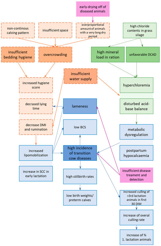The interrelations between the results from the analysis of the environment, animal-related indicators and the risk factors identified are summarized in Figure 2. The aggregated list of final problems, mainly regarding metabolic problems, consists of the following: