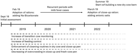 As a short-term solution for the unfavourable DCAD in the rations of the lactating groups, the local nutritionist suggested to add bicarbonate, which was implemented from February 2019 onwards (a timeline of interventions is given in Figure 3). Before and after the implementation of the ration changes, blood and urine samples were collected from the late-lactation and dry cows to obtain insights into the metabolic consequences in these target groups Table A10, Table A11 and Table A12. As expected, we observed an increase in the net acid–base excretion (NABE) to physiological levels between the two samplings. Furthermore, many of the grassland fields of the farm are on high moor soils, predisposing the grass silages to having low DCAD values [70]. As an option for future harvests, the application of more suitable fertilizers for these sorts of soils, for example potassium-sulphate- instead of chloride-containing fertilizers were suggested [71].