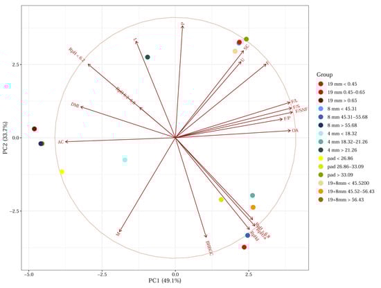 Principal Component Analysis of TMR Structure Tertiles and Their Relationship with Milk Production and Rumen Indicators. Abbreviations: 19 mm—ratio of particles caught on 19 mm sieve, 8 mm—ratio of particles caught on 8 mm sieve, 4 mm—ratio of particles caught on 4 mm sieve, Pad—ratio of particles caught on the pad, OA—oleic acid in milk, F/P—milk fat-to-protein ratio, F/S—milk fat-to-milk dry matter ratio, F/SNF—milk fat-to-milk non-fatty dry matter ratio, F/L—milk fat-to-milk lactose ratio, AC—milk acetone, BHBGC—betahydroxy butyrate in milk, M—milk production, F—milk fat, P—milk proteins, L—milk lactose, SC—somatic cells count in milk, U—milk urea, RpH7a—rumen pH 7 days average (3 days before TMR analysis, 3 days after TMR analysis), RpHd—rumen pH on the day of TMR structure analysis, <6.2—rumen pH frequency spent under the risk of SARA, 6.2–6.8—rumen pH frequency spent in the optimal pH, >6.8—rumen pH frequency spent in the risk of ketosis, DMI—dry matter intake of TMR. The length of each line (vector) indicates the strength of the variable’s contribution to the principal components. Longer lines mean the variable is better represented in the plot. The distance between the points (groups) reflects their similarity; closer points are more similar in their overall variable profiles.