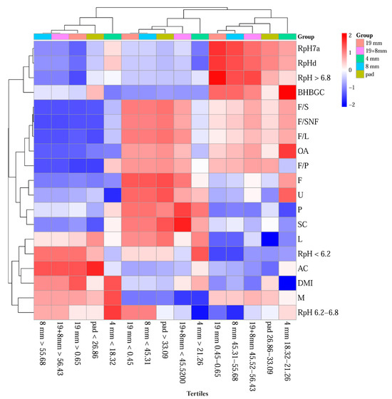 Heatmap and Hierarchical Clustering of TMR Structure Tertiles on Milk Production and Rumen Indicators. Abbreviations: 19 mm—ratio of particles caught on 19 mm sieve, 8 mm—ratio of particles caught on 8 mm sieve, 4 mm—ratio of particles caught on 4 mm sieve, Pad—ratio of particles caught on the pad, OA—oleic acid in milk, F/P—milk fat-to-protein ratio, F/S—milk fat-to-milk dry matter ratio, F/SNF—milk fat-to-milk non-fatty dry matter ratio, F/L—milk fat-to-milk lactose ratio, AC—milk acetone, BHBGC—betahydroxy butyrate in milk, M—milk production, F—milk fat, P—milk proteins, L—milk lactose, SC—somatic cells count in milk, U—milk urea, RpH7a—rumen pH 7 days average (3 days before TMR analysis, 3 days after TMR analysis), RpHd—rumen pH on the day of TMR structure analysis, <6.2—rumen pH frequency spent under the risk of SARA, 6.2–6.8—rumen pH frequency spent in the optimal pH, >6.8—rumen pH frequency spent in the risk of ketosis, DMI—dry matter intake of TMR.