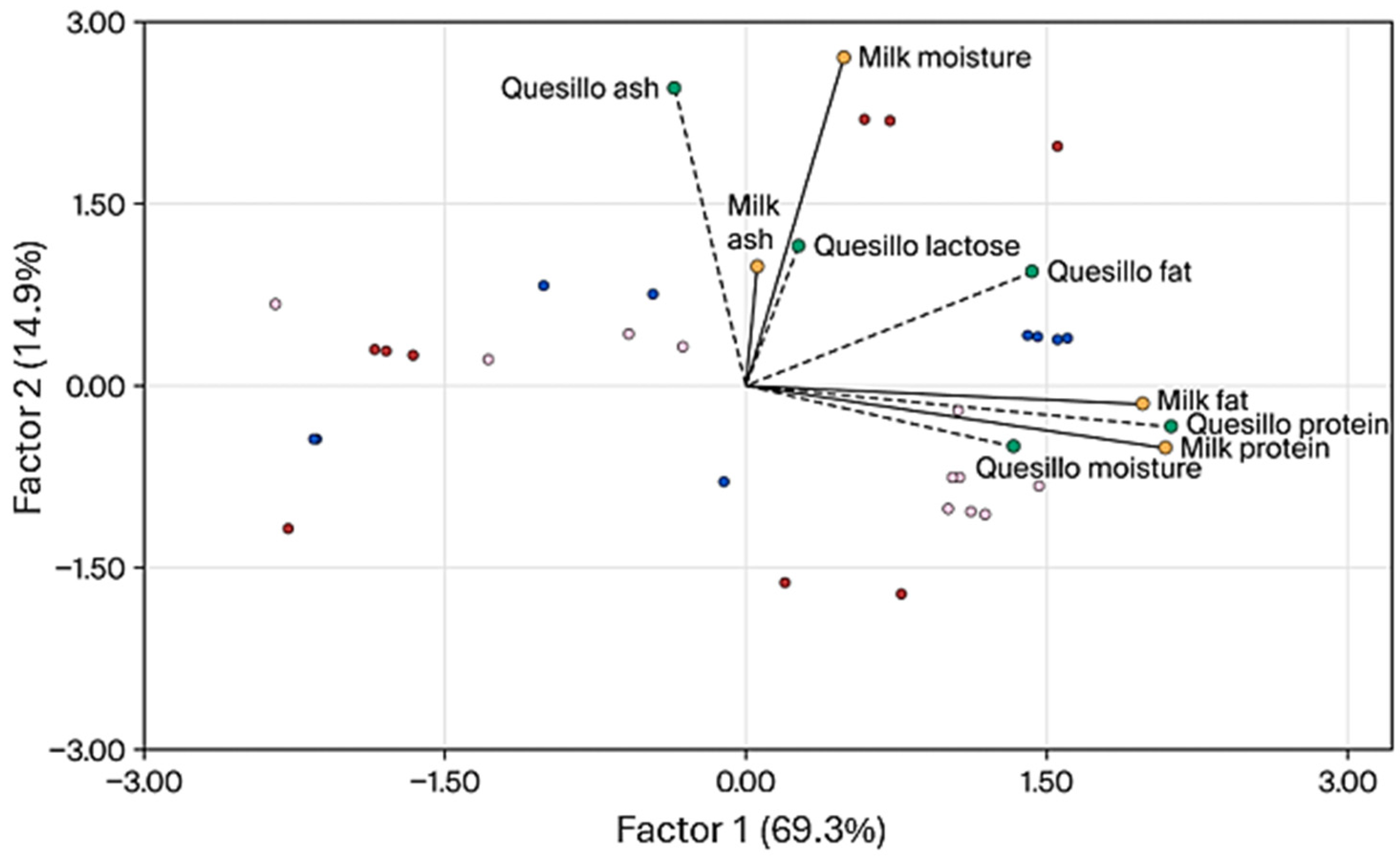 | Milk Origin | Milk Protein (%) | Milk Fat (%) | Milk Moisture (%) | Milk Ash (%) | Quesillo Protein (%) | Quesillo Fat (%) | Quesillo Lactose (%) | Quesillo Moisture (%) | Quesillo Ash (%) |