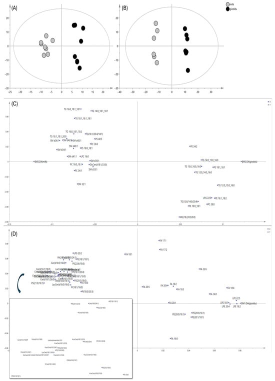 OPLS-DA score plot of (A) positive ion mode (PIA) data and (B) negative ion mode (NIA) data. The black circles represent Gioddu samples, while gray circles represent raw milk samples. The OPLS-DA analysis for PIA showned the following validation parameters: R2X = 0.518, R2Y = 0.96 and Q2 = 0.443; while for the NIA model were: R2X = 0.591, R2Y = 0.994 and Q2 = 0.933. Loadings plot for the PIA model (C) and NIA model (D) on the lipidomic analysis.