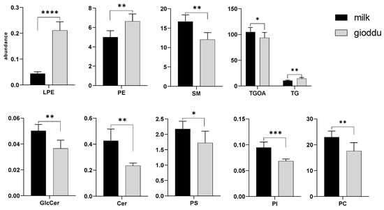 The results indicate that Gioddu samples exhibit higher levels of phosphatidylethanolamine and lysophosphatidylethanolamine, alongside lower levels of glucosylceramides, ceramides, sphingomyelins, phosphatidylinositols, phosphatidylserines, and phosphatidylcholines when compared with raw milk samples. Moreover, triglycerides containing FA 18:1 in their molecular structure were found to be reduced in Gioddu samples compared to raw milk, while those lacking FA 18:1 showed a corresponding higher level.