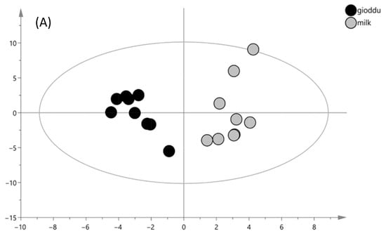 Untargeted metabolomic profiling of sheep milk and Gioddu showed clear clustering between raw and fermented samples, indicating a significant metabolic shift during fermentation. Multivariate analyses (PLS-DA and OPLS-DA) confirmed this separation, with the OPLS-DA model displaying good classification and predictive performance (Figure 3A), while the relative loadings plots are reported in Figure 3B.