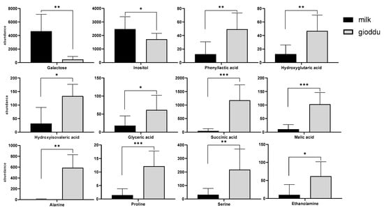 Graphs bar showing the relative abundance of principal polar metabolites detected in raw milk (black bars) and Gioddu samples (gray bars). Data are expressed as mean ± standard deviation; * p < 0.05, ** p < 0.01 and *** p < 0.001 vs. control (ANOVA with Tukey’s post hoc test).