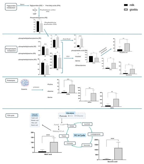 As reported, Gioddu samples exhibited lower levels of sugars such as galactose and inositol compared to sheep milk samples, while showing higher concentrations of carboxylic acids including hydroxyisovaleric, succinic, malic, hydroxyglutaric, and glyceric acids. In addition, amino acids such as alanine, proline, serine, and ethanolamine were identified as discriminant features between the two sample types, showing significantly higher levels in Gioddu compared to raw sheep milk. The metabolomic differences observed between Gioddu and sheep milk samples reveal distinct biochemical profiles likely influenced by species-specific metabolism and microbial fermentation processes.