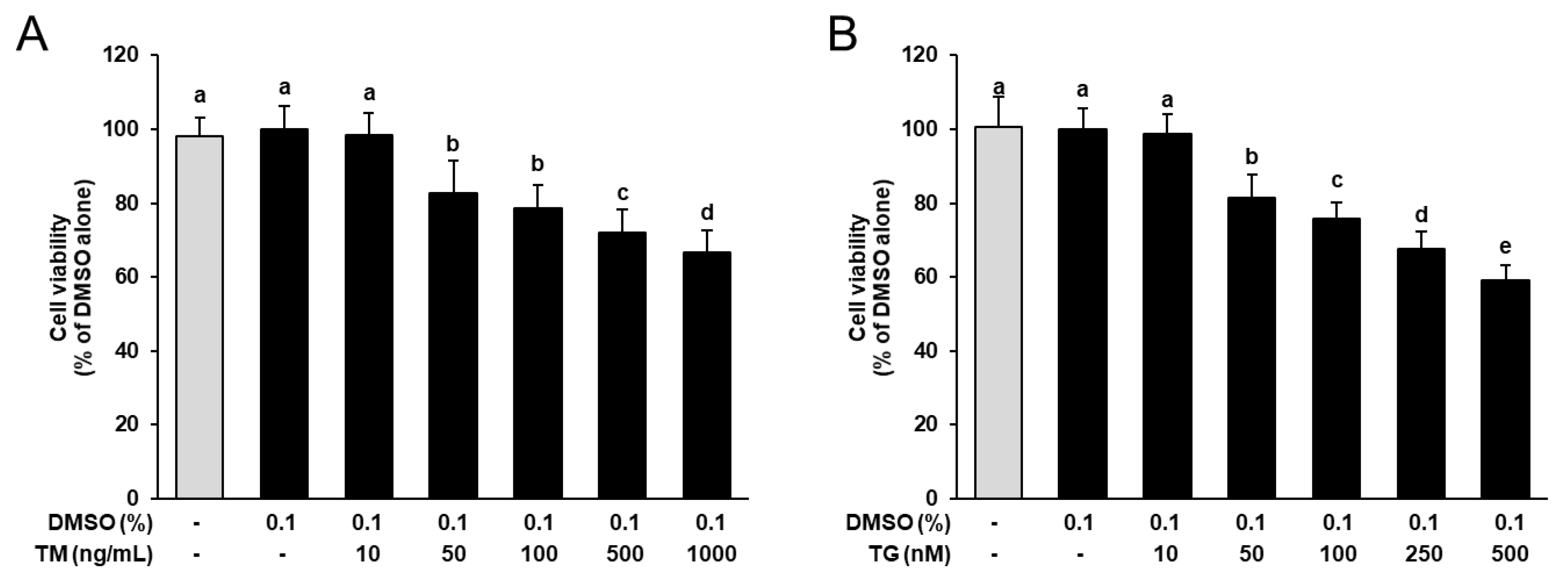 4 cells/well, and incubated in culture medium until reaching 70–80% confluency. Subsequently, cells were treated with medium only or medium containing vehicle only or TM or TG at different concentrations (TM: 10, 50, 100, 500, 1000 ng/mL; TG: 10, 50, 100, 250, 500 nM) for 24 h. Subsequently, cell viability was determined by the 3-(4,5-dimethylthiazol-2-yl)-2,5-diphenyltetrazolium bromide (MTT; Sigma-Aldrich, Taufkirchen, Germany) assay as described recently [