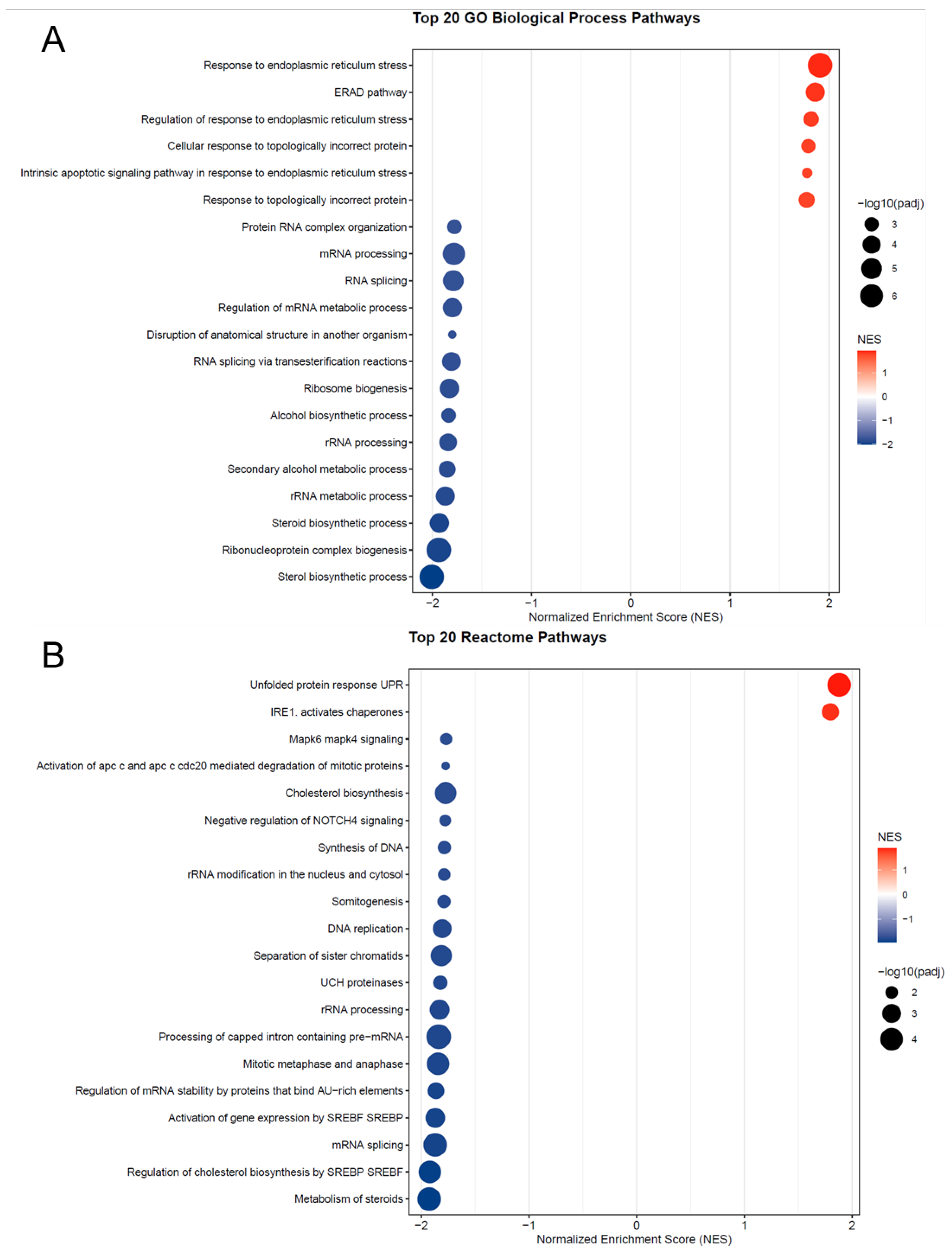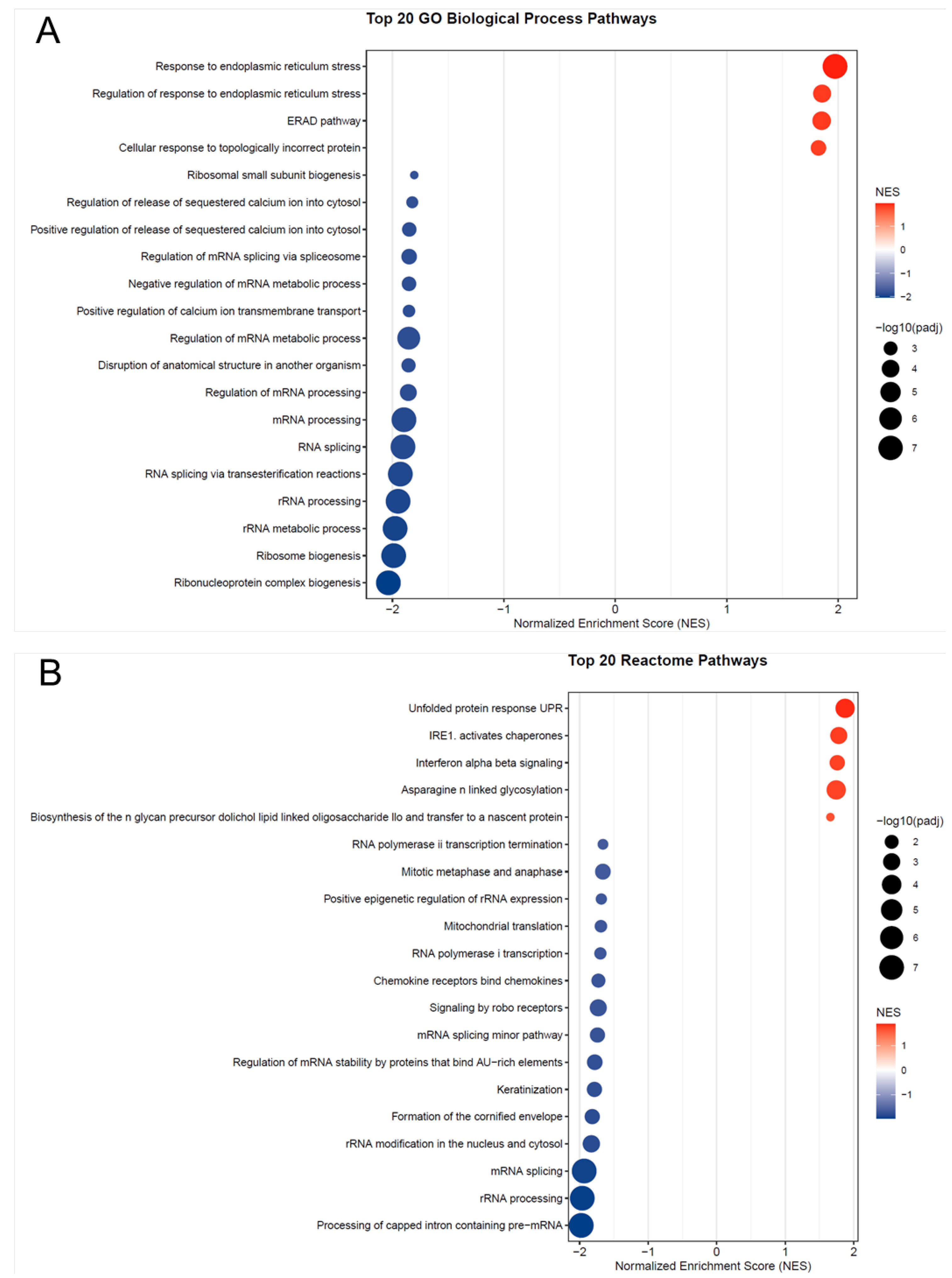 p-value < 0.05. Normalized Enrichment Scores (NES) were computed to account for gene set size and correlations. Enrichment results were visualized as dot plots, displaying the top 20 pathways per database. All analyses were conducted in R (4.5.1) [