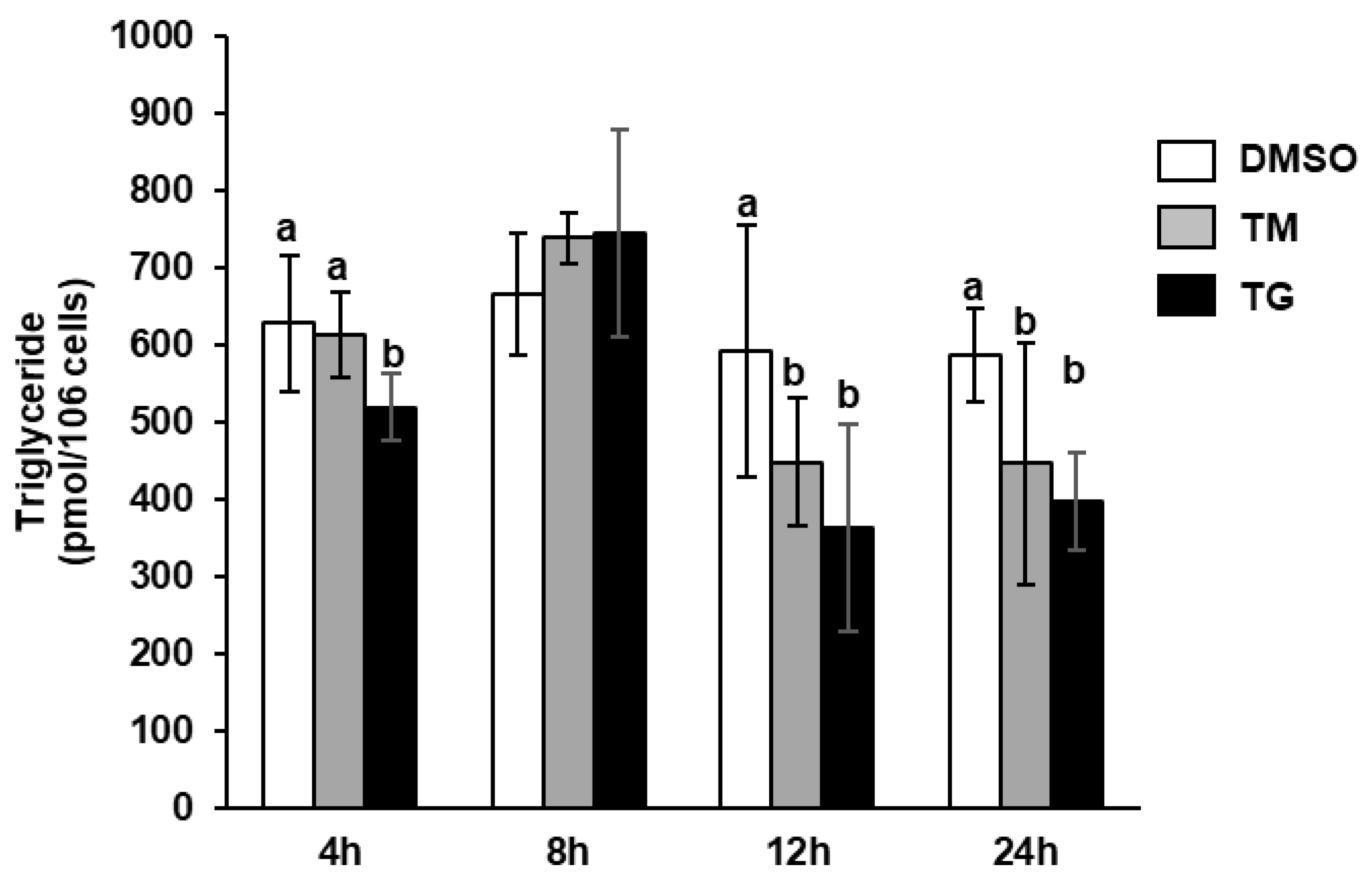 49]. In our study, both TM and TG treatments resulted in reduced intracellular triglyceride levels. For TM, this reduction likely reflects simultaneous inhibition of lipogenesis and stimulation of β-oxidation. For TG, the decrease in triglyceride content may be attributed primarily to enhanced β-oxidation. Future fatty acid oxidation flux experiments using