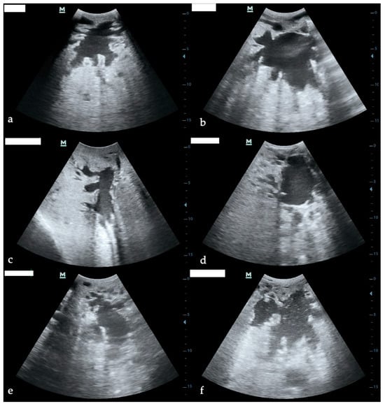 Ultrasonographic images of bovine glandular cisterns. (a,b) Healthy quarters in transverse (a) and longitudinal (b) sections. (c,d) Subclinical mastitis (SCM) quarters in transverse (c) and longitudinal (d) sections. (e,f) Clinical mastitis (CM) quarters in transverse (e) and longitudinal (f) sections.