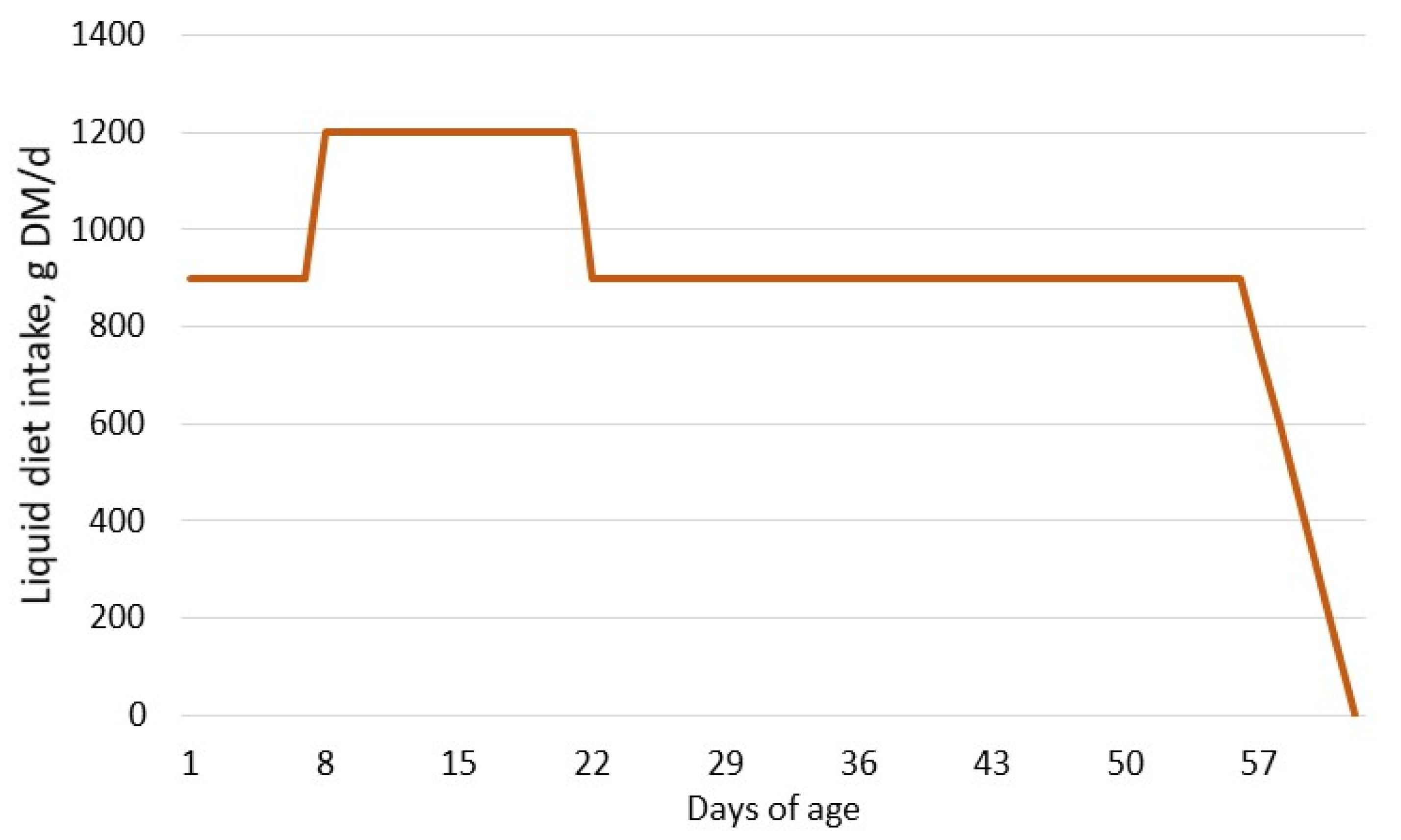 The calves were fed 6 L/d of the respective liquid diet during the first week, 8 L/d from day 8 to day 21, and again 6 L/d from day 22 to 56 days of life, when gradual weaning began by reducing 1 L/d, with complete weaning at 62 days (