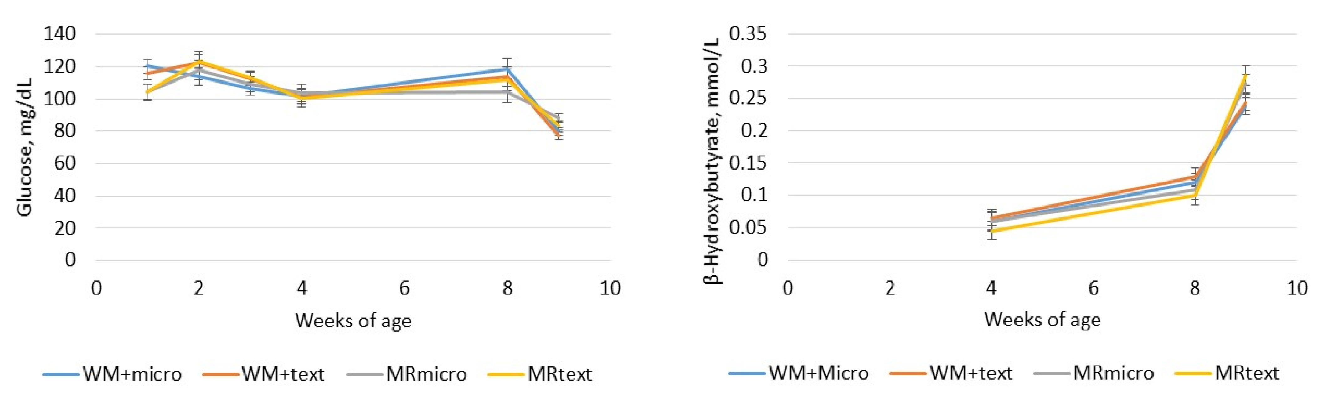 44]. During the first weeks of life, plasma glucose concentrations in calves is around 100 mg/dL, but they gradually decrease to close to 60 mg/dL, characteristic of adult ruminants, as the rumen develops. In general, plasma glucose concentrations are reduced, while concentrations of SCFA and BHBA increase, concomitantly with an increase in starter intake and consequent ruminal development [
