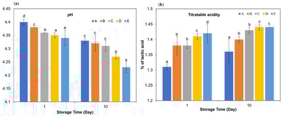 As shown in Figure 1a, the use of different milk types significantly affected the pH and titratable acidity of kefir samples after 10 days of storage (p < 0.05). Despite differences in milk type, all kefir samples reached comparable final pH values between 4.3 and 4.4 after 24 h, consistent with previous reports [23,24]. The pH is a critical quality parameter in fermented dairy beverages as it directly influences microbial activity, flavor development and shelf life [25]. In the first day of storage, significant differences were found between the samples in terms of both pH and titratable acidity, and this inter-sample variation continued on the 10th day (p < 0.05). Samples A and B showed higher initial pH values, while samples D and E showed lower pH values. Although a decrease in pH was observed in all samples at the end of storage, this change in samples during the storage period was found to be statistically significant (p < 0.01). When titratable acidity values were examined, it was determined that samples D and E had higher initial acidity levels, while sample A showed a lower value. At the end of the storage period, an increase in titratable acidity occurred in all samples. The t-test analyses show that the changes in kefir samples throughout the storage days are statistically significant at the p < 0.01 level. Similarly, milk type had a significant influence on protein, total solids, fat, and fat-in-dry matter values of the kefir samples. These findings are in agreement with previous studies on kefir [23,26,27].