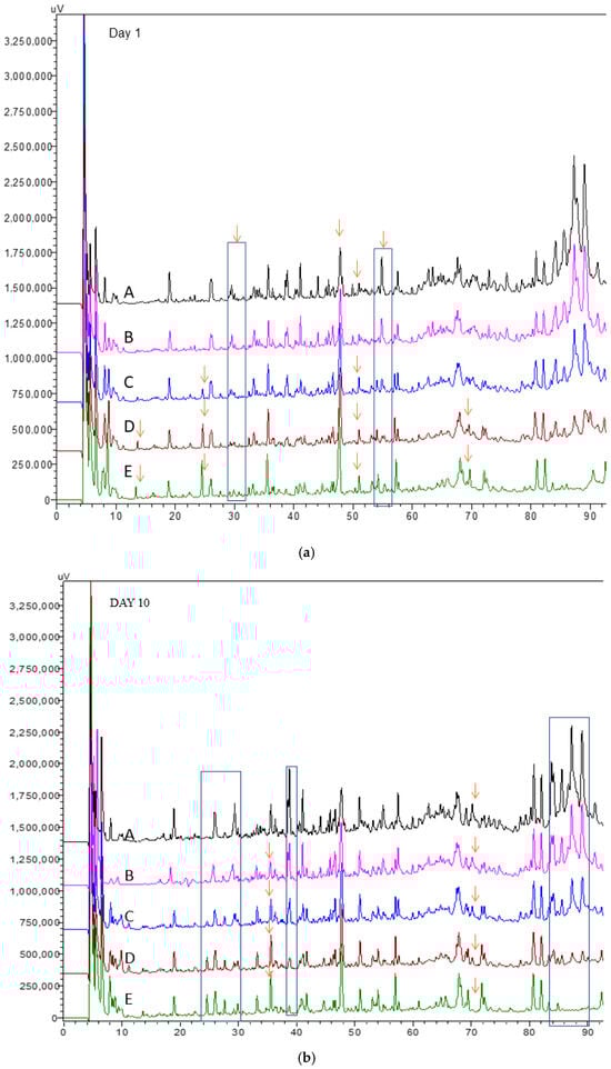 RP-HPLC peptide profiles in kefir made using with cow’s and goat’s milk after day 1 (a) day10 (b). A: 100% cow milk; B: 75% cow’s milk + 25% goat’s milk; C: 50% cow’s milk + 50% goat’s milk; D: 25% cow’s milk + 75% goat’s milk; E: 100% goat’s milk. The arrows indicate that different samples have different peak heights at their respective retention times.
