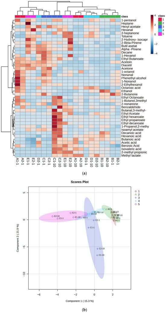 Data were analyzed with SPSS v9 (SPSS Inc., Chicago, IL, USA) using one-way ANOVA and Duncan’s Multiple range test for significance at p < 0.05. Kefir trials were conducted in duplicate. Volatile compound data underwent heatmap and o-PLSDA component analysis (o-PLSDA) and correlation analysis using a software (MetaboAnalyst6.0) for multivariate evaluation.