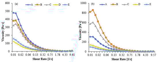 The viscosity values presented in Figure 7a,b correspond to the apparent viscosity measured as a function of shear rate, reflecting the shear-thinning behavior of kefir. Sample codes A–E represent increasing proportions of goat milk in the formulation; therefore, the curves also compare the rheological effect of the goat milk additive. Sample A (100% cow’s milk) had the highest viscosity and showed a slower decrease in viscosity with increasing shear rate. Viscosity decreased significantly as the proportion of goat milk increased, with pseudoplastic behavior characterized by lower initial viscosity, particularly in samples D and E. Sample E (100% goat’s milk) had the lowest viscosity profile and exhibited a flatter curve across the shear rate.