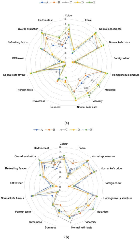 Sensory evaluation plays a crucial role in consumer acceptance and choice, with aroma and flavor being the most important factors influencing purchase decisions for dairy products. The sensory evaluation results of kefir samples prepared with different cow and goat milk ratios were analyzed separately for day 1 and day 10. Figure 8a,b present the sensory data for five kefir samples during storage. On day 1, most attributes such as colour, foam, normal appearance, and normal kefir taste did not differ significantly among the samples, indicating that initial fermentation did not strongly affect these characteristics. However, some attributes, including mouthfeel, viscosity, foreign taste, normal kefir odour, overall evaluation, and hedonic test, showed statistically significant differences (p < 0.05). In particular, samples with higher goat milk content tended to exhibit higher viscosity and mouth coating scores, whereas the foreign taste was rated lower in cow-dominated samples. Viscosity, closely related to texture, is also a key factor affecting consumer preference [8].