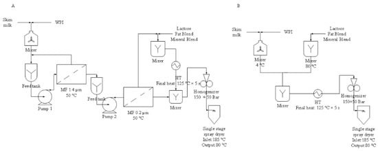Processing scheme for the production of (A) membrane-filtrated infant milk formula (MEM-IMF) and (B) high-heat-treated infant formula (HT-IMF).