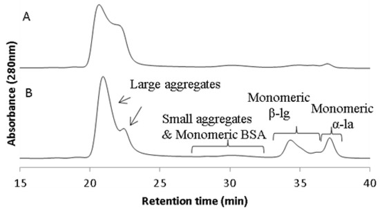 Size exclusion chromatograms (SEC-HPLC) of (A) high-heat-treated infant milk formula (HT-IMF) and (B) membrane-filtered infant milk formula (MEM-IMF).