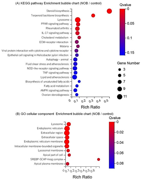 Differentially expressed genes and pathways in BEECs. (A) KEGG enrichment analysis of differentially regulated genes between the control and NOB-treated groups; 20 pathways showed significant variations (p < 0.05). (B) GO cellular component enrichment analysis of differentially regulated genes between the control and NOB-treated groups; 10 pathways showed significant variations (p < 0.005).