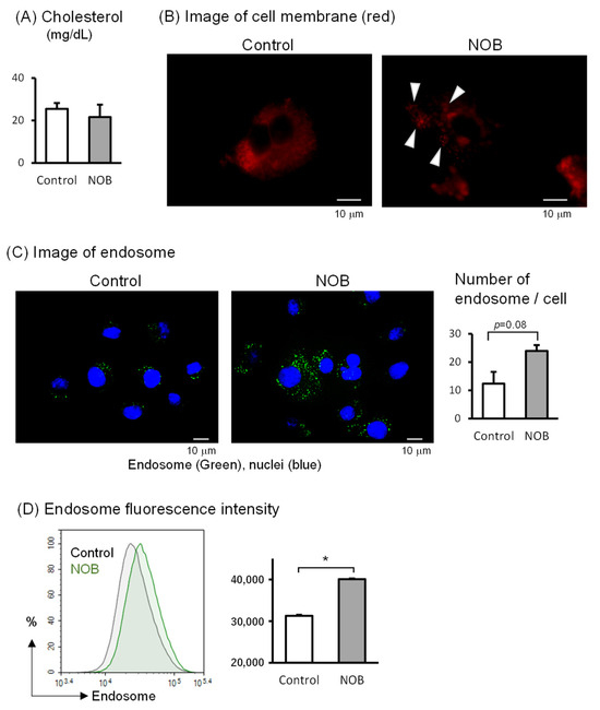Effects of NOB on cholesterol, cell membrane, and endocytosis in BEECs. BEECs were treated with or without NOB for 24 h. (A) Intracellular cholesterol levels were determined. (B) After treatment, cell membranes were stained and observed using fluorescence microscopy. Arrowheads indicate dot-like staining area. (C) After treatment, the endocytosed cells were stained and observed using a fluorescence microscope. The number of cells endocytosed was calculated (n = 3–4). (D) After treatment, the fluorescence intensity of the endosomes was determined by flow cytometry (n = 3–4). The results are shown as mean ± SEM. * p < 0.05.