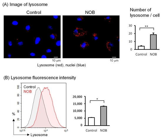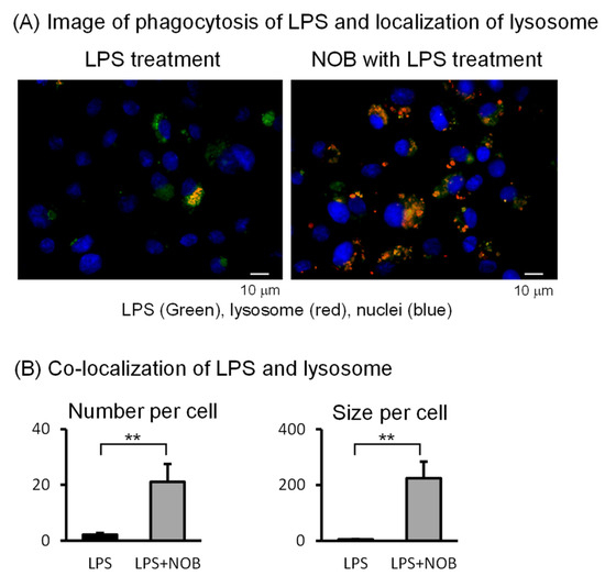 Bacteria invade the epithelial cells and proliferate, causing the infection to spread. As a defense mechanism against such bacteria, the uptake of foreign material via the endocytosis–lysosomal pathway and its subsequent elimination within the cell is important [29]. Because NOB may increase the endocytosis–lysosome system, we investigated whether NOB regulates lysosomal function in BEECs. Therefore, we performed phagocytosis assays using fluorescence-conjugated LPS (a major component of bacteria) and observed the lysosomes in BEECs after NOB treatment. After treatment with fluorescence-conjugated LPS, a green fluorescent area was observed in BEECs, indicating the phagocytosis of LPS in BEECs (Figure 4A, left panel). Additionally, red fluorescence (lysosomes) and yellow fluorescence areas (co-localization of green and red colors) were observed, indicating that some phagocytosed LPS were co-localized with lysosomes. In the NOB-treated groups with fluorescence-conjugated LPS, almost all phagocytosed LPS were co-localized with lysosomes (Figure 4A, right panel). We confirmed an increased number of co-localization areas of fluorescence-conjugated LPS and lysosomes (Figure 4B, left), and their size was significantly higher in BEECs treated with NOB (Figure 4B, right). These findings suggest that NOB activates phagocytosis of the bacterial component LPS and that NOB-induced lysosomes may take up this LPS in BEECs.