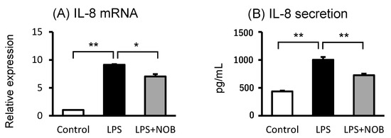 Effects of NOB on inflammatory cytokines in BEECs. BEECs were pretreated with or without NOB for 24 h and then further treated with LPS for 24 h. (A,B) After treatment, IL-8 mRNA expression and IL-8 secretion were determined by qPCR and ELISA (n = 3–4). The results are shown as mean ± SEM. * p < 0.05 or ** p < 0.01.