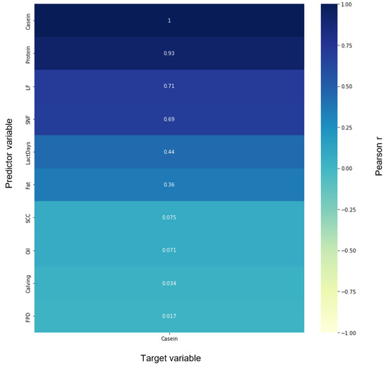 We used mathematical modeling methods for finding the best candidate input variables. We tried to find variables that associate significantly with the value of casein. The degree of association is measured by a correlation coefficient, denoted by r and is a measure of linear association. We created a heatmap of the correlations [20] for each variable to help the first choice (Figure 1). In the heatmap, higher values (higher correlation of variables) are represented with darker colors and lower values with lighter colors.