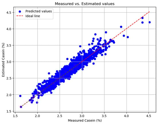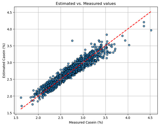 The best multiple linear-regression model had 86% accuracy, the mean bias on the independent test set was +0.003%, the slope bias −0.10 (regression slope = 0.90), and the random error (SD of debiased residuals) 0.094%. The Lin concordance correlation coefficient reached 0.95, indicating excellent overall convergence with laboratory casein measurements. This result is good enough for general usage when exact casein quantity is not required.