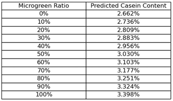 The simulation adjusts these milk parameters proportionally to the microgreen supplementation ratio, which ranged from 0% (no microgreens) to 100% (theoretical maximum contribution to the protein source). The baseline values and adjustment ranges for each parameter were derived from the statistical analysis of the original milk dataset used in this study, ensuring consistency with real-world milk composition data. For each supplementation level, the adjusted parameters were fed into the pre-trained machine learning models (both linear regression and multi-layer perceptron neural network) to estimate the corresponding casein content.