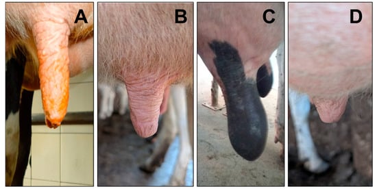 In the current context of productivity with quality, it is essential to identify and eliminate factors associated with poor mammary gland health, including environmental and management conditions as well as animal-specific traits, such as teat conformation traits. According to [], teat conformation traits are used in animal breeding programs to improve productive lifespan and are associated with lower culling risks as scores approach the ideal. Unfavorable teat conformation traits, such as teats that are too large or positioned too close together, can increase the risk of mastitis in cows []