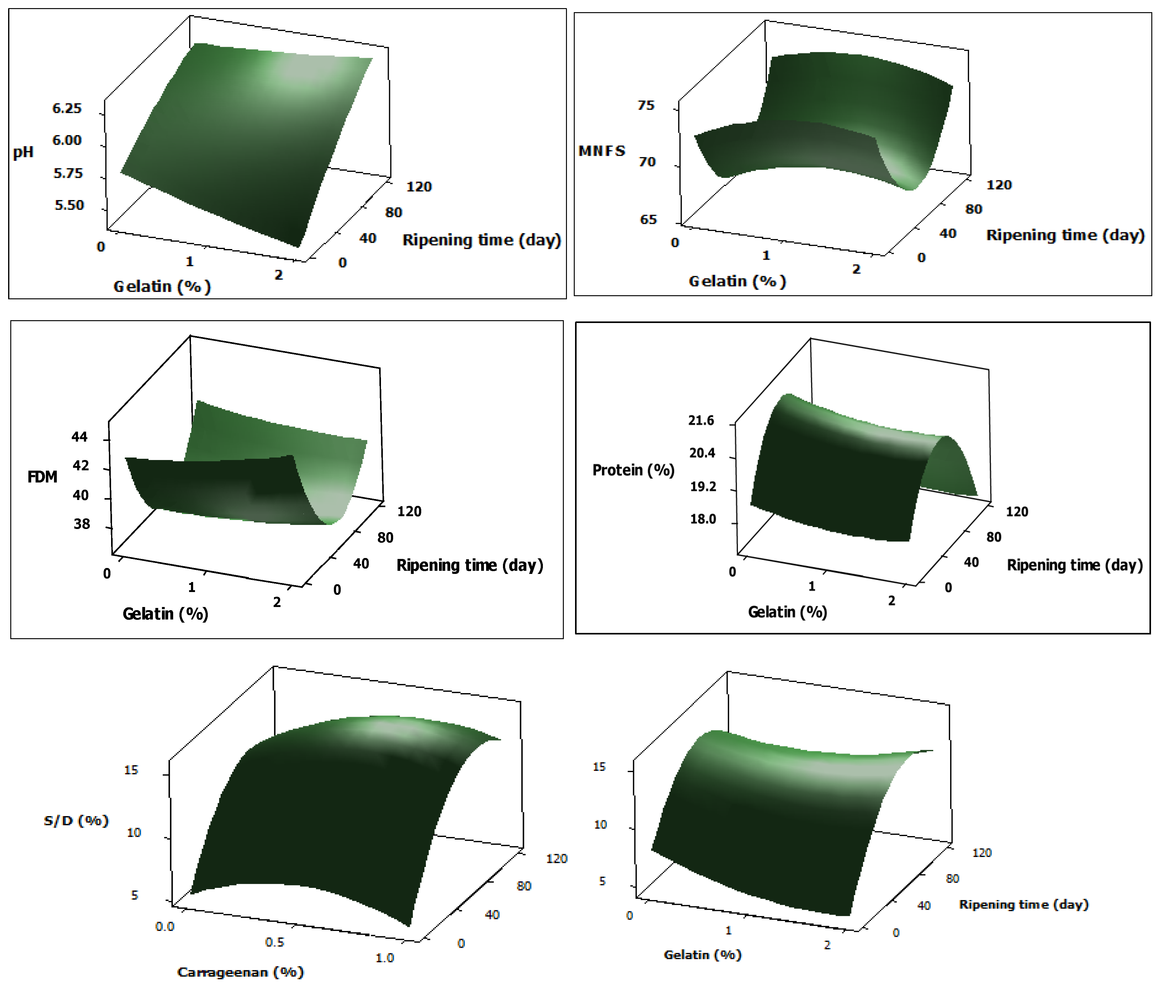 The significance of independent variables (X1: storage time, X2: carrageenan concentration, X3: gelatin concentration) on cheese pH and composition, as indicated by F-ratio and associated p-values, are given in Table 2. All compositional parameters were significantly influenced by storage time. Response surface plots of pH, moisture in non-fat solids (MNFS), fat in dry matter (FDM), protein and S/D, are given in Figure 1.