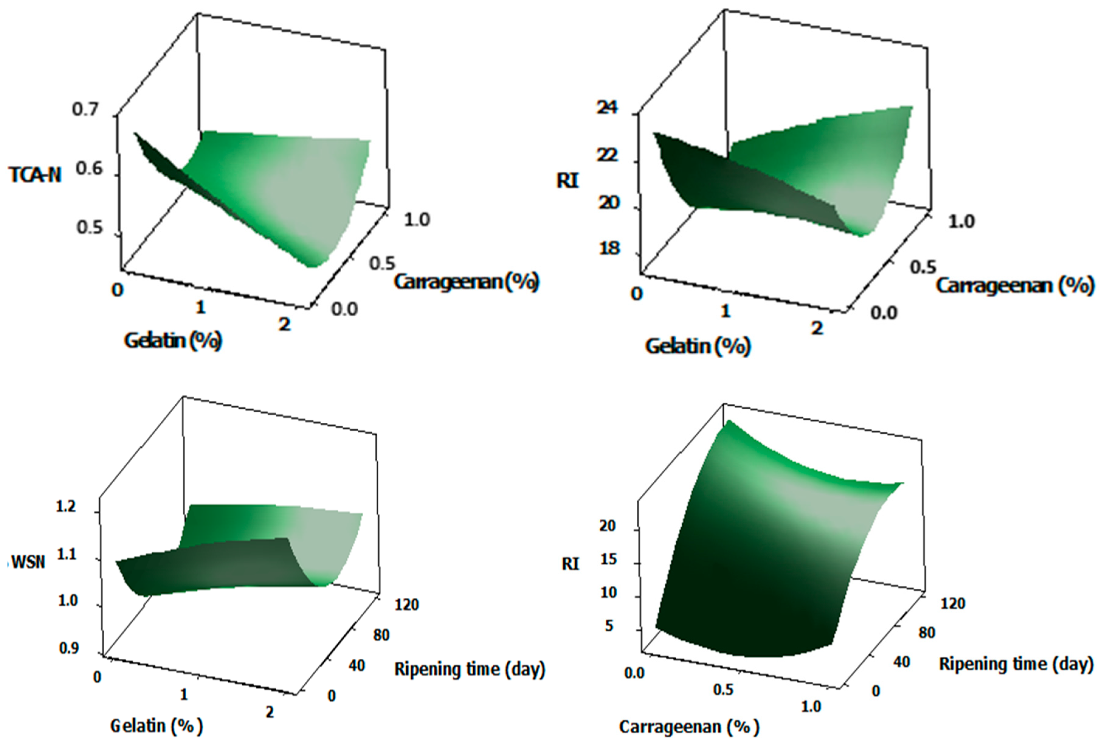 The significance of independent variables (X1: storage time, X2: carrageenan concentration, X3: gelatin concentration) on WSN, TCA-N and RI in the final models are given in Table 2. While carrageenan and gelatin did not affect WSN content, TCA-N and RI were significantly influenced by especially the interaction effects of storage time, and carrageenan and gelatin concentrations. Response surface plots of independent variables that significantly influenced TCA-N, WSN and RI are given in Figure 2. The rest of the surface plots are presented in Supplementary Materials Figure S2. The TCA-N amount appeared to decrease with increasing gelatin concentrations. Carrageenan reduced TCA-N accumulation at the 0.5% level; however, it appeared to have no significant effect on proteolysis at the 1% concentration. This may be attributed to the higher S/D ratios observed at 0.5% carrageenan, as increased salt levels are known to limit proteolysis [13]. Ozbek and Guzeler [16] reported that adding 0.05% carrageenan to the brine slowed proteolysis during the first 30 days of storage; however, by day 60, the degree of ripening was similar to that of the control. Carrageenan has been reported to form a semi-permeable film, depending on its density and the extent of surface gel formation [28]. Stabilizers added to the brine can influence the proteolysis of the cheese through their impact on diffusion of the moisture and salt to cheese. They can lead to higher levels of proteolysis if they impede the salt transfer to the cheese. Lower internal NaCl concentrations can accelerate proteolysis, as high salt levels typically inhibit the activity of proteolytic enzymes [29]. If a dense gel-like brine forms with the addition of the stabilizers, brine could also act as a barrier preventing the diffusion of enzymes and microbial metabolites and that would reduce proteolysis.