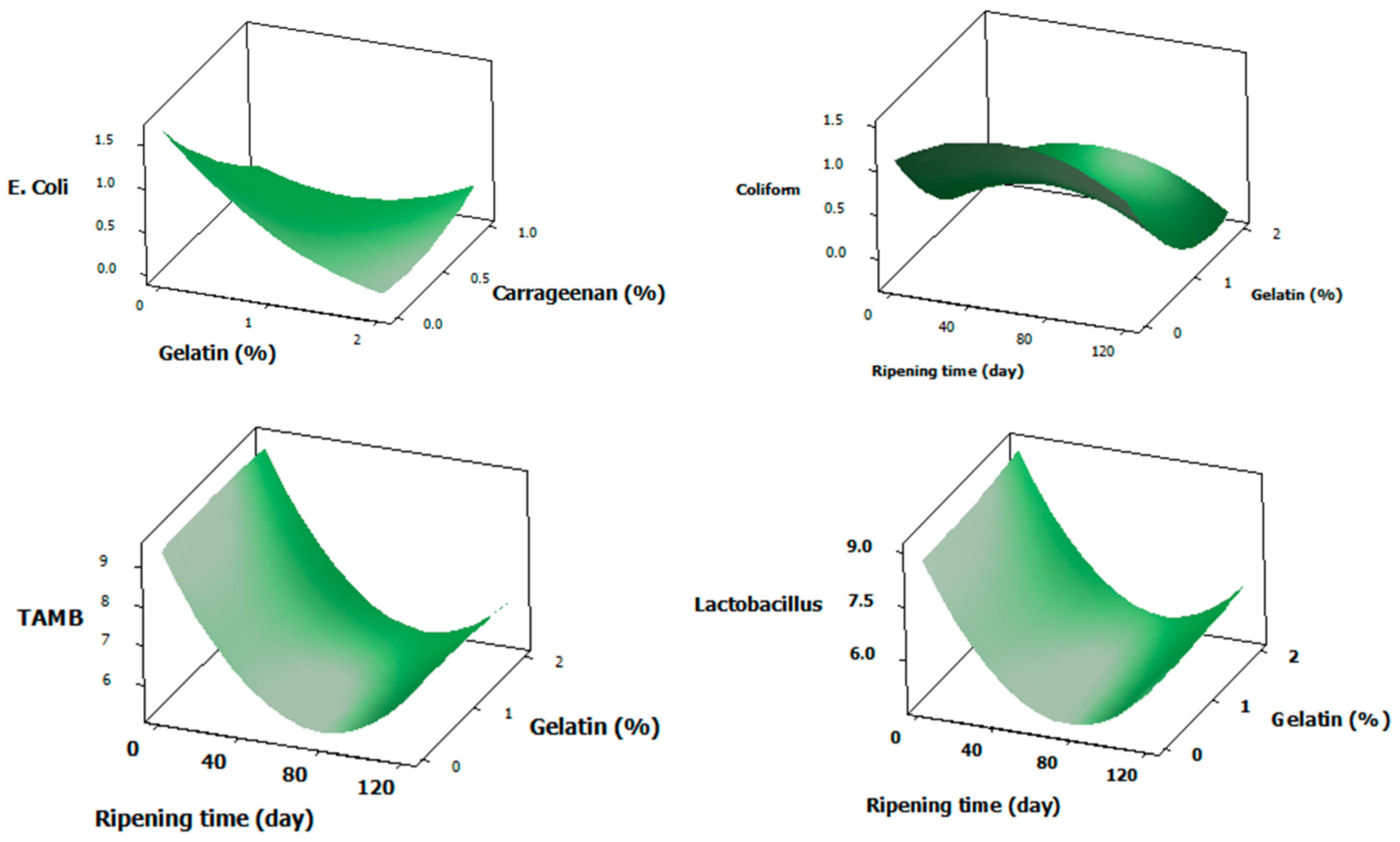 The significance of independent variables (X1: storage time, X2: carrageenan concentration, X3: gelatin concentration) on microbiological counts are given in Table 2. E. coli counts were significantly reduced by gelatin and carrageenan; their interaction effect was also significant (p < 0.05). Response surface plots of microbial counts are given in Figure 3 and are mostly based on significant figures. The rest of the surface plots can be found in Supplementary Materials Figure S3. Lactobacillus, TMAB and coliform counts were not affected significantly by stabilizers (p > 0.05). TAMB and Lactobacillus were significantly influenced and reduced by ripening, but stabilizers did not have an impact on them. Cankurt reported that stabilizers in the brine did not influence the starter culture [14]. Lactobacillus can adapt to acidic and low water activity conditions; they usually thrive deeper in the cheese curd and form microcolonies surrounded by protein and fat networks [33], whereas E. coli resides mostly at the surface and is more exposed to brine conditions and much less tolerant to low water activity [34]. Adding stabilizers to the brine probably created a harsher environment that E. coli could not survive. On the other hand, the counts of Lactobacillus and TMAB, which largely consist of LAB and related groups, were not affected by the stabilizers. We did not detect any yeast and mold in any of the cheese samples.