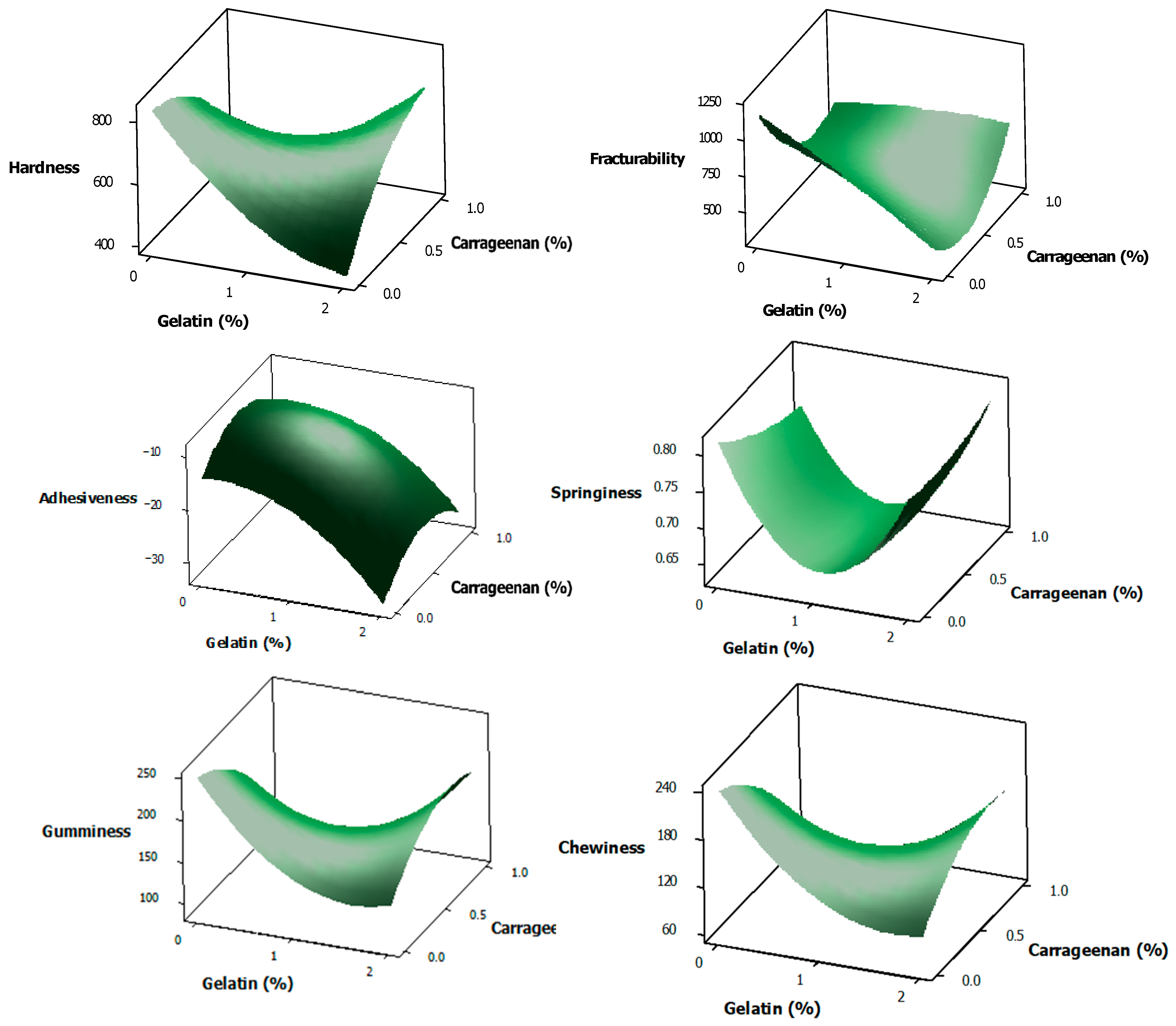where Y is the response variable, b0 is a model intercept, and Xi and Xj are the factor levels for storage time, gelatin and carrageenan concentrations with bi, bii and bij indicating linear, quadratic and interaction terms. To show the effect of independent variables on responses, three-dimensional surface plots were generated for significant response variables.