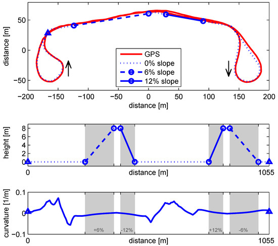 Test track, with the location of the slopes. Measured GPS positions (red) are overlaid on the map data (blue). Distance measurement is started at the blue triangle, taking the U-turn, and followed by the +6% slope. After 1055 m the test cycle repeats. The curvature in both U-turns is significant, thereby limiting the maximum speed.
