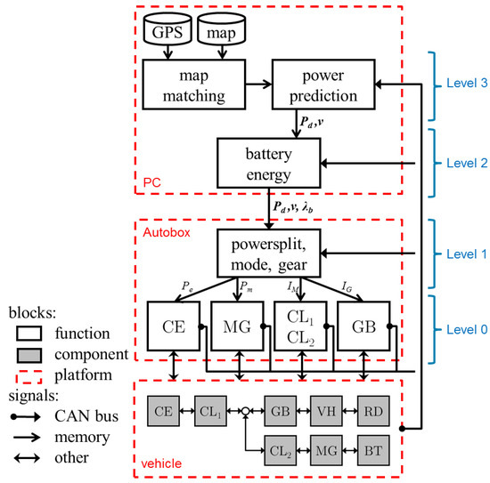 The multi-level EMS from [14] is implemented on the HEV. The algorithms on each level are mapped to two control platforms as depicted in Figure 3. Level 0 and 1 are running as compiled code on a dSpace Autobox to provide fast and predictable algorithm execution under all circumstances (i.e., ‘hard real time’). Level 2 and 3 are running on a PC as MATLAB code, facilitating the development of optimization algorithms, which have typically less strict real-time characteristics (i.e., ‘soft real time’). The minor coupling between the two control platforms improves robustness and facilitates parallel function development.