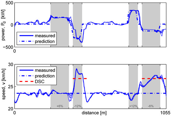 - The predicted speed of 24 km/h is not maintained in the downhill (−12%, −6%) sections, where speed increases towards 29 km/h. This is caused by the design of the speed control system on the truck: cruise control is not allowed to apply braking. The DSC function is allowed to control the braking system but has a higher speed setpoint (27 km/h, indicated by the red dashed line). Due to the change in speed setpoint, some potential energy is temporarily converted to kinetic energy instead of brake energy, which is best illustrated on the −12% slope: during acceleration the measured braking power is smaller than predicted, while during the deceleration to the cruise setpoint the increased kinetic energy is converted to brake energy again, shown by the larger measured, than predicted, braking power.