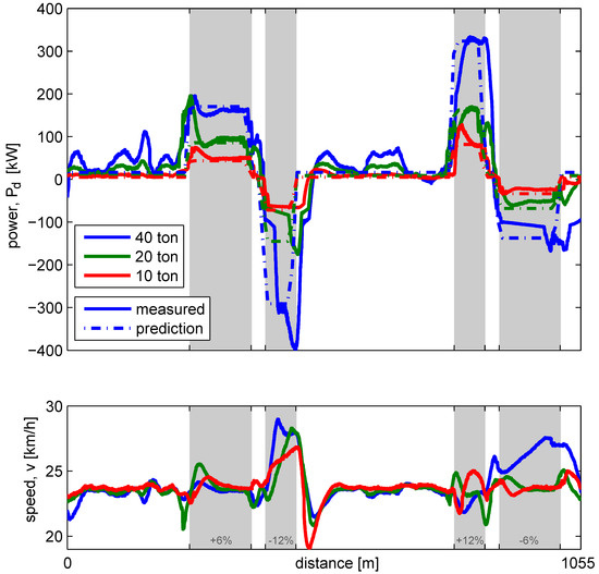 The accuracy of the prediction is influenced by the vehicle parameters, where the vehicle mass has a very large influence on the predicted road load. Validation of this parameter variation is performed by driving with the vehicle configurations from Section 2.1, resulting in three vehicle masses: 10, 20 and 40 ton. The mass parameter in the prediction, is updated using the onboard mass estimation of the vehicle. In Figure 5 the predicted and measured power demand are shown for each configuration.