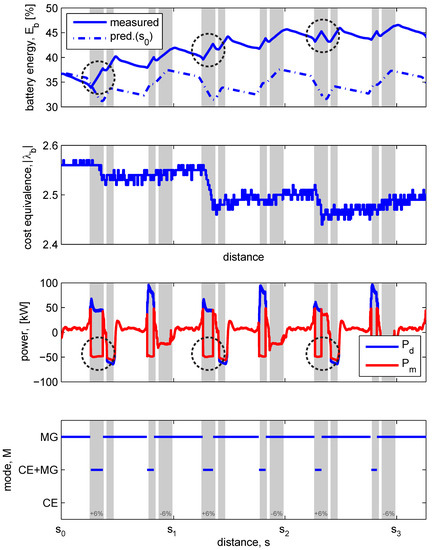 The corrective action of the feedback controller is acting mainly in one part of the cycle: the +6% slope. By lowering , the threshold for charging rises (see in [14], Figure 9), resulting in a shorter period of charging on the +6% slope, and to a lesser extent on the +12% slope. Because Level 2 calculates the corrective action over the whole horizon, it is able determine, where the corrective action improves the charge sustenance, with the least fuel penalty. On the rest of the cycle, the modes are identical from cycle to cycle. This contrasts with direct feedback control on the predicted trajectory, as is done in [3,16], where corrections take place whenever the error is large, and not per se where the cost is lowest.