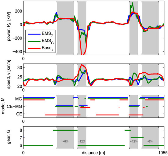 Figure 7 shows, from top to bottom, the measured power demand and velocity, and the mode and gear decisions. For Base7, large speed overshoots and undershoots occur near the 12% slope. Because this EMS must rely on feedback, it is typically too late in implementing a mode switch, resulting in large speed deviations due to the open driveline event on the slope. On the −12% slope the correct mode is eventually selected, where the braking power of CE+MG is needed to control the speed.